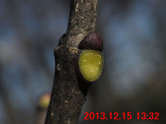 風のため、継続観察していた果実と萼は、撮影失敗。代わりに、どうにか、幼木の冬芽と葉痕・維管束痕を撮影してみた。