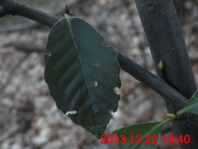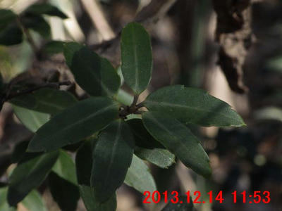 葉は対生(互生のようにも見える)。ゆるやかな粗い鋸歯のある常緑樹。