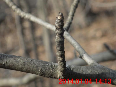 奇異な形をした毛むくじゃらの冬芽(裸芽)が目立つ樹があった。残った葉軸から、ウルシ科ウルシ属の樹のような気がしたが、経験不足で、明確に同定できなかった。