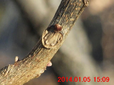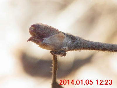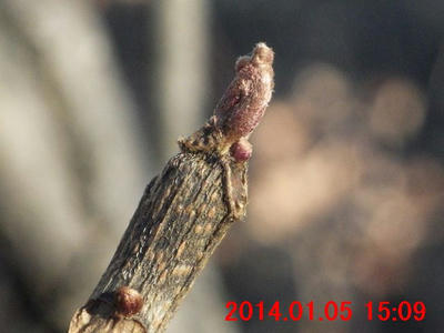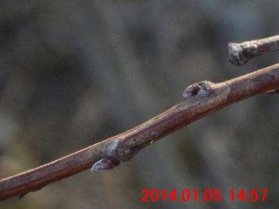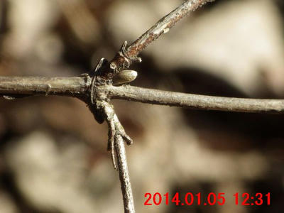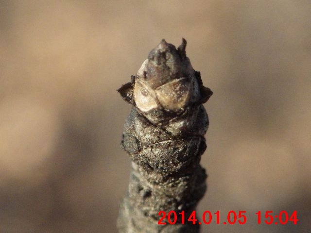 11月23日の画像と比較すると、葉が落ちたことに気付く。側芽の下の葉痕・維管束痕が観察できた。