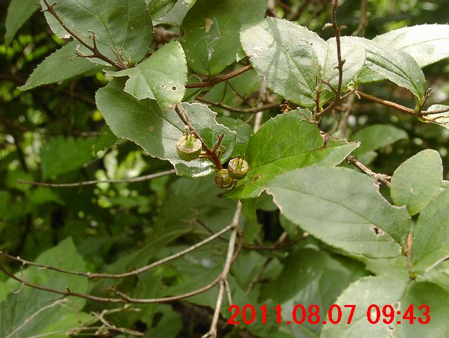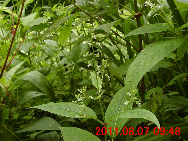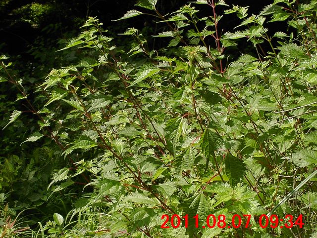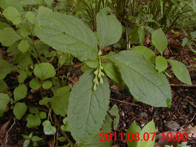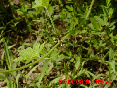 2011年6月から、葉の先端が亀の尾状に伸びる形が気になっていた。この日の観察で、コアカソと同定できた。イラクサ科の存在も知った日である。