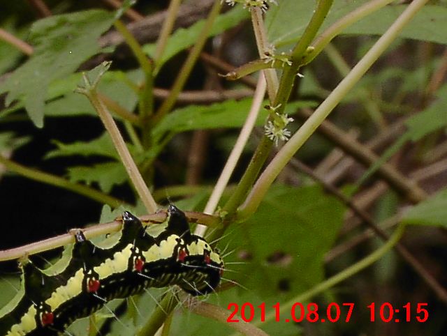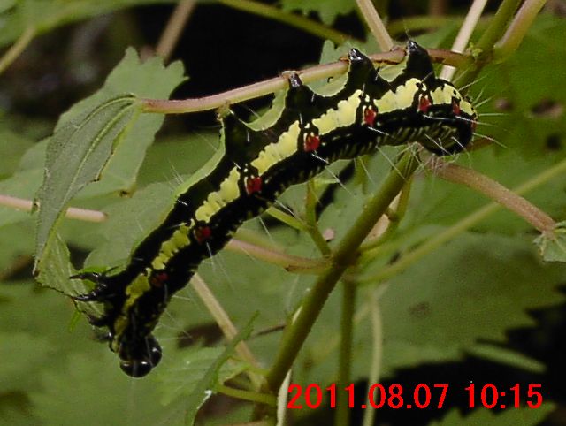 フクラスズメ 凶暴なやつ。2012年には、1本のコアカソ(小赤麻) に3匹たかっているのを見た。1匹が振動し始めたら、他の2匹も振動を始めた。異様な光景だった。