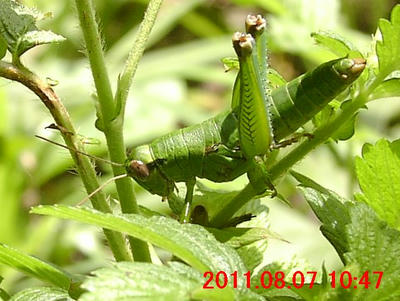 キンミズヒキに乗っているフキバッタの幼体??(イナゴ科)