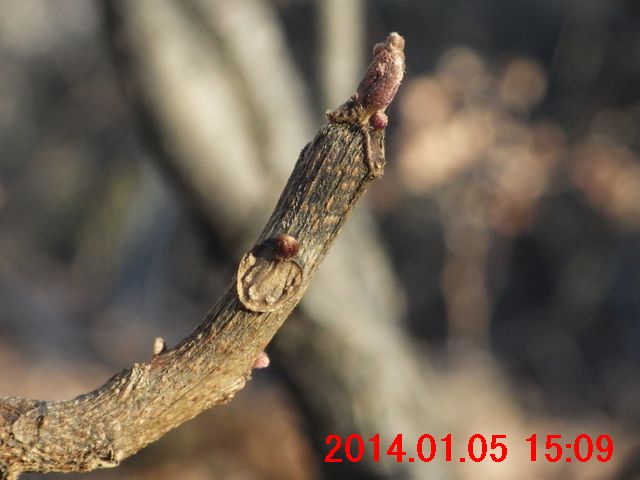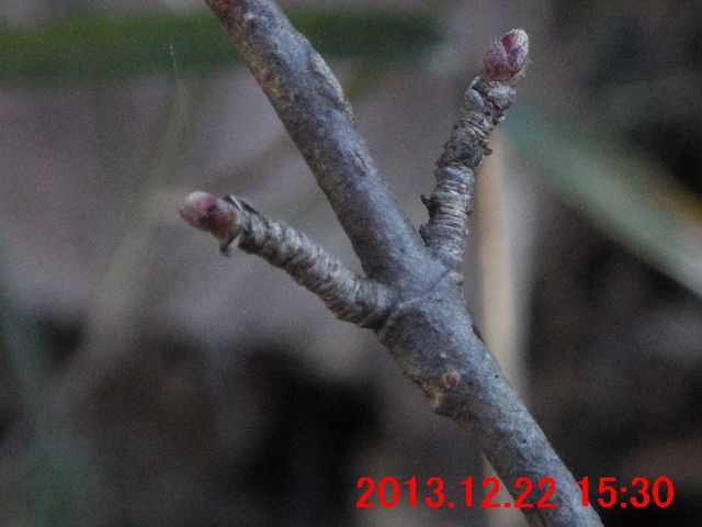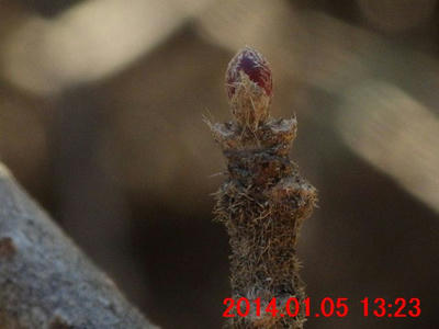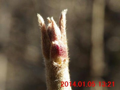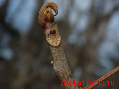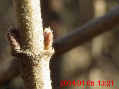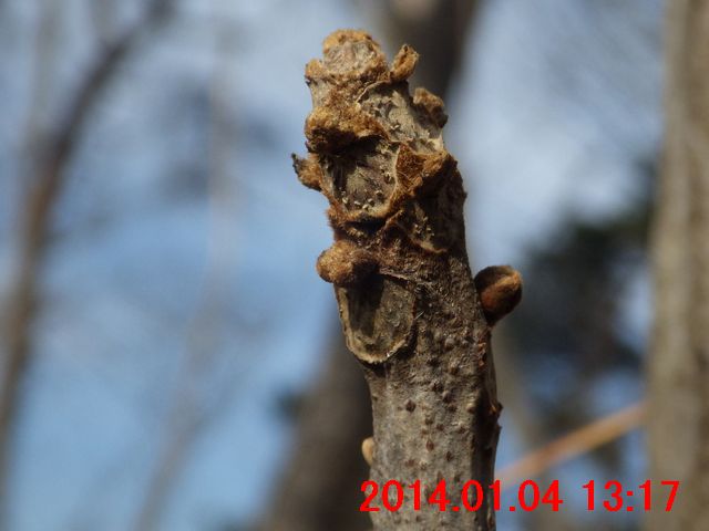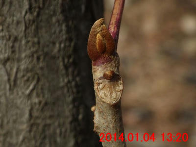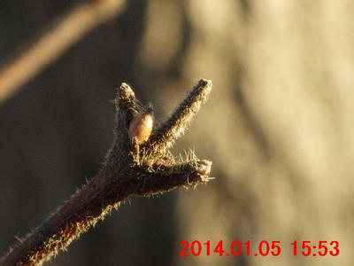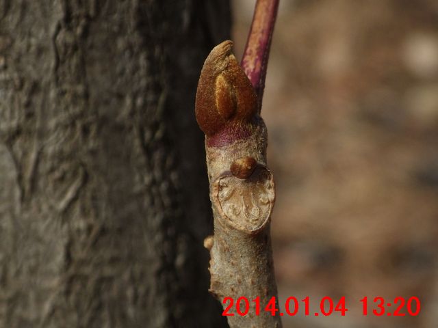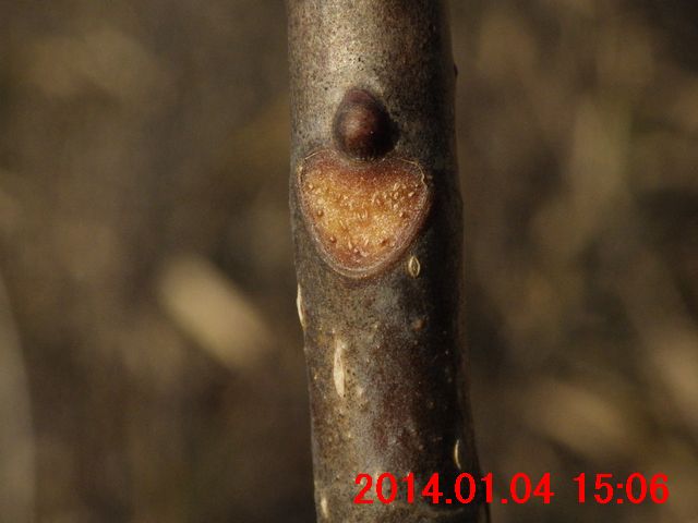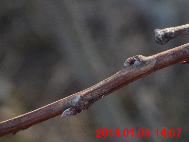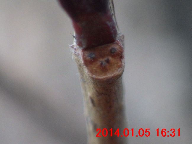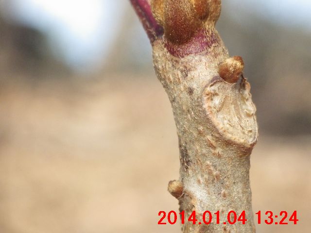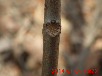 11月23日の画像と比較すると、葉が落ちたことに気付く。側芽の下の葉痕・維管束痕が観察できた。