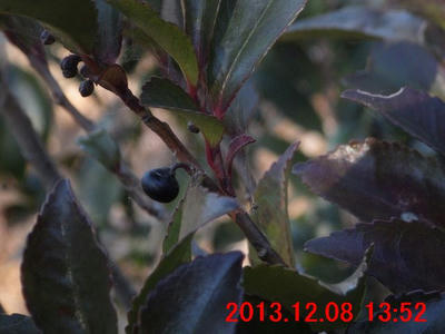 ●葉の長さ2cm程度の常緑樹に、10φ程度の果実(画像 1)。葉は互生。新観察樹。