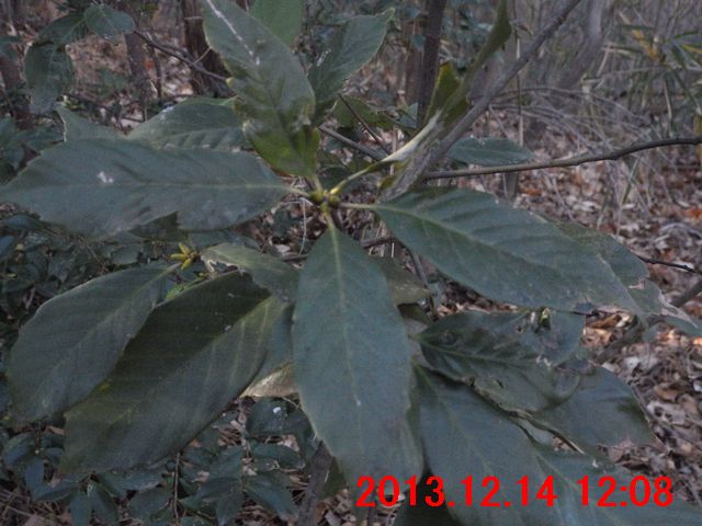 ●観察し易い高さの幼木があった。葉の長さは8cm程度。葉先の1/3ほどの鋸歯が顕著。先端は尾状に突き出ている。