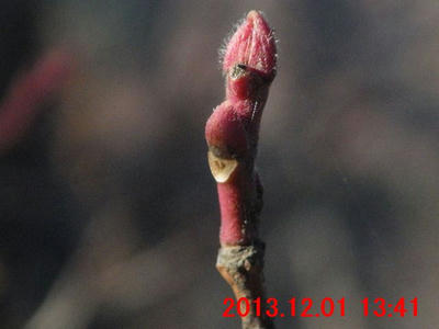 春に一気に伸びた奇数複葉、葉柄赤色の樹の冬芽。